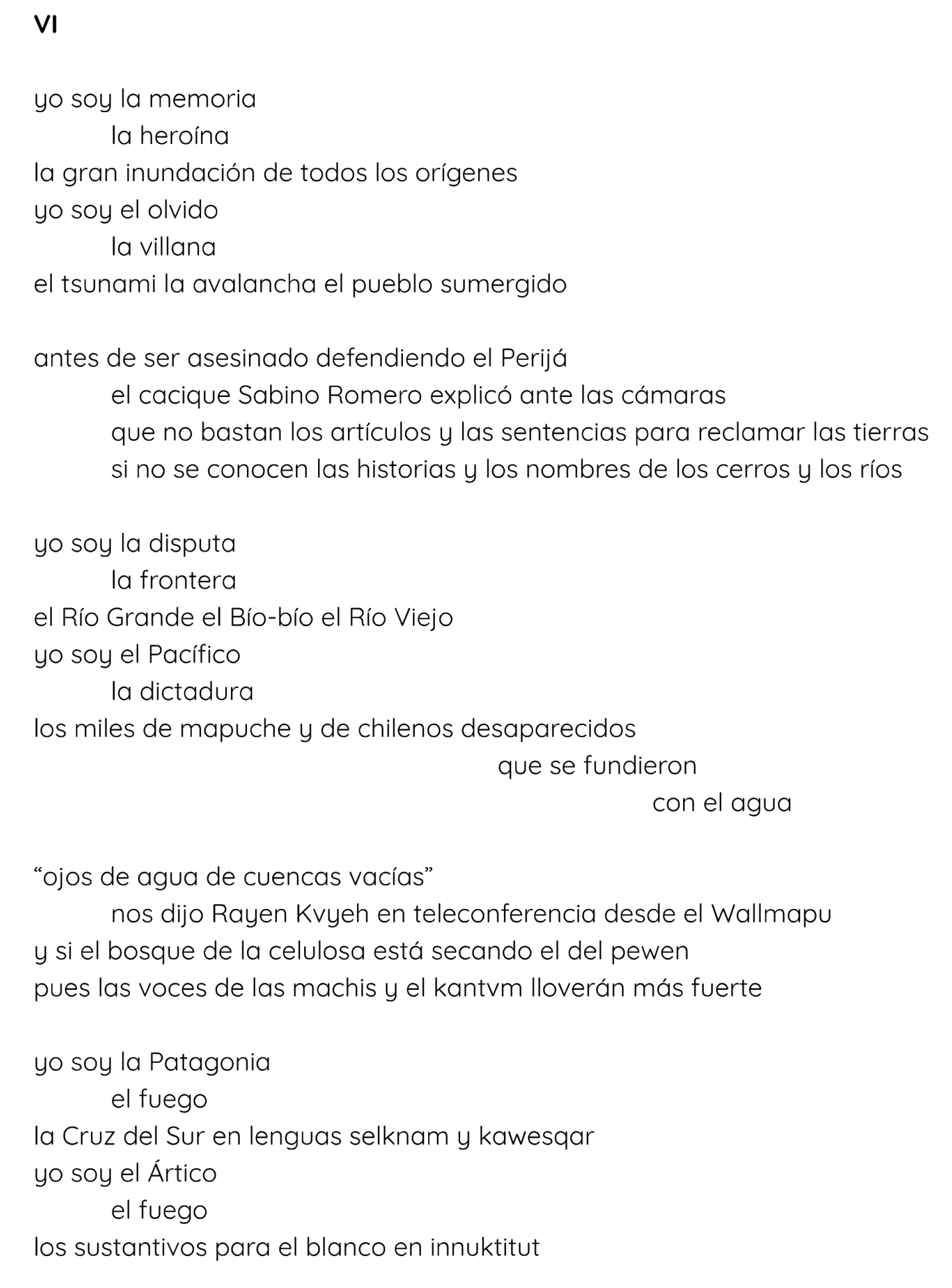 Los siguientes versos son un homenaje a los abuelos y abuelas, activistas y escritoras que han protegido con su propia vida el agua pura de sus territorios. La paráfrasis de cartas, discursos, poemas, conversaciones persigue aquí una voz colectiva. Son fragmentos del poema “Las voces del subsuelo y los yacimientos”, publicado en Altamar (Universidad de Antioquia, 2017).
